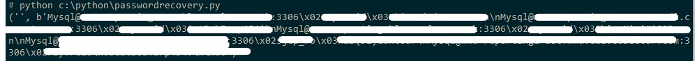 import win32cryptimport osencrypted_data = open("C:\\Users\\{}\\AppData\\Roaming\\MySQL\\Workbench\\workbench_user_data.dat".format(os.getlogin()), "rb").read()clear_data = win32crypt.CryptUnprotectData(encrypted_data, None, None, None, 0)print(clear_data)