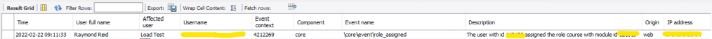 This will produce results from the database which are like the following from the Moodle Logs in the GUI